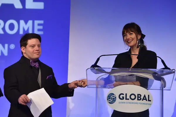 Dakota Johnson och Zack Gottsagen på Global Downs syndrom Foundation 10 -årsjubileum BBBY Fashion Show på Sheraton Denver Downtown Hotel den 20 oktober 2018 i Denver, Colorado. (Foto av Tom Cooper/Getty Images för Global Downs Syndrome Foundation)
